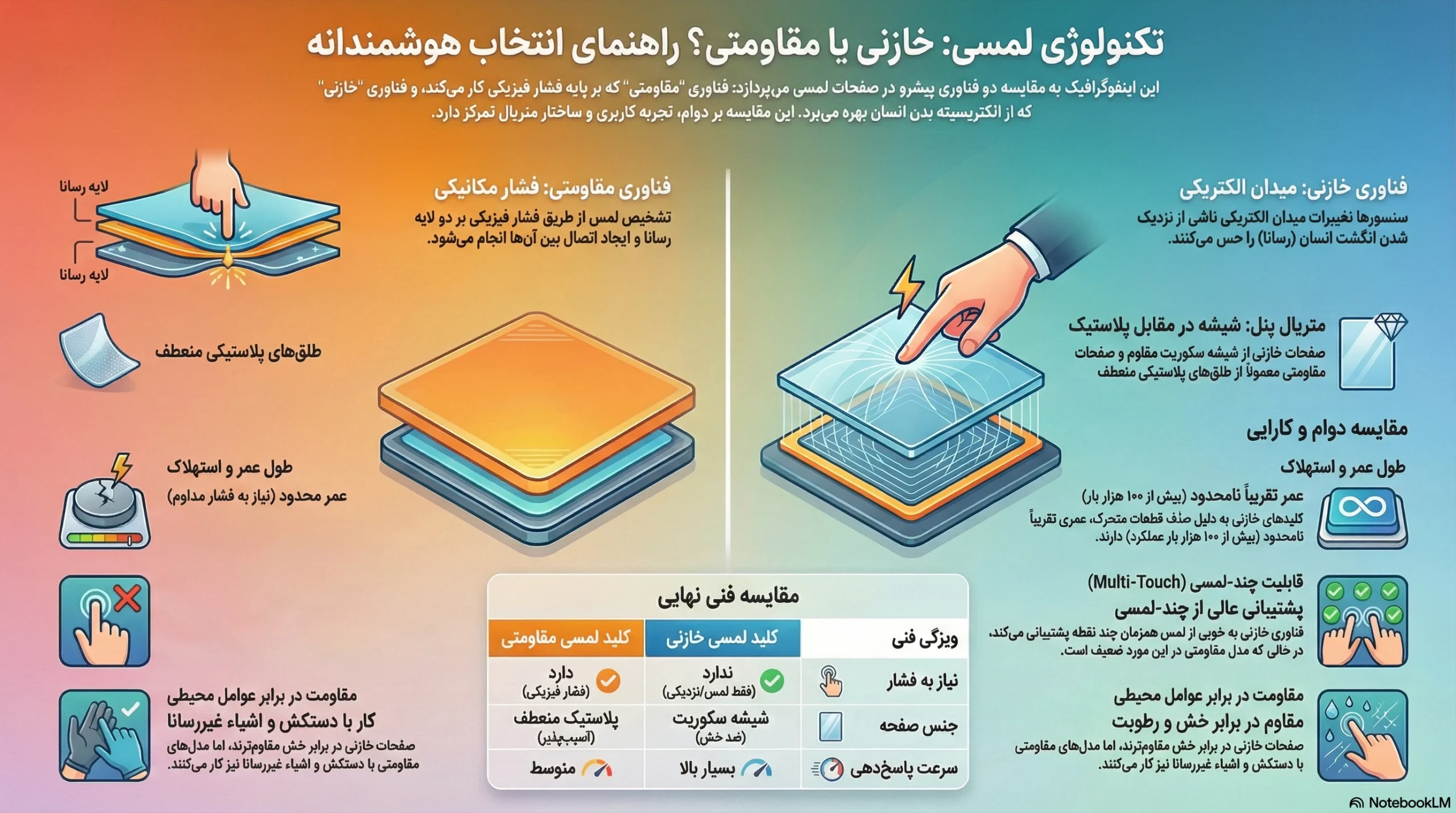 | ابزارهای قابل لمس | فقط انگشت انسان یا اشیاء رسانا (با دستکش معمولی کار نمیکند) | تمامی اشیاء (انگشت، دستکش، قلم استایلوس و هر شیء سخت) | مدل مقاومتی برای محیطهای کارگاهی که استفاده از دستکش الزامی است مناسبتر است. |